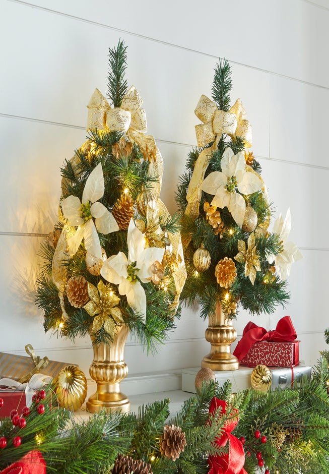 Our festive tabletop Christmas tree makes it easier than ever to brighten up your home for the holidays. It comes pre-lit and decorated with ornaments, bows, and 20 lights. It's the perfect side table accent or a dining table centerpiece. PLEASE NOTE: Two pieces are shown, each sold individually.