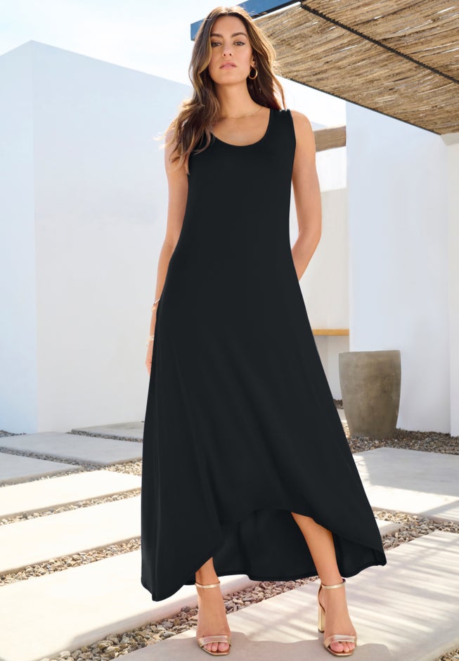 This sleek V-neck maxi dress features a flattering fit-and-flare silhouette with godet panels at the sides for added movement. Crafted from a soft, stretchy blend, it offers both comfort and style, with a smooth scoop neckline and a straight hem for a timeless, elegant look.