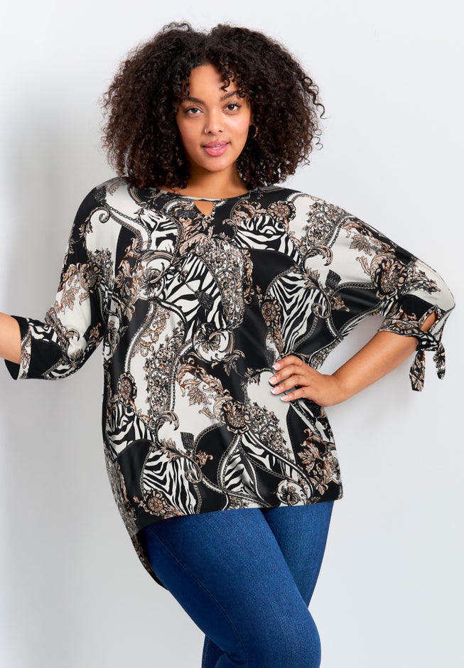 The Analise Top boasts a round neckline with cut-out detail, 3/4 length arm coverage, with a modest hip hemline, the perfect pick whether you're heading to work or lunching with the girls on the weekend. Key Features Include:- Round neckline with cut-out detail- 3/4 sleeves with tie-knot cuff detail- Relaxed silhouette- Hi-lo hemline- Pull on design- UnlinedModel wears an Avenue size 16. Bust: Fitted.Waist: Relaxed fit.Hips: Relaxed fit.Length: This plus size top has a hi-lo length hemline.Center back measurement: 31 inches/79 cm. 95% Viscose, 5% Elastane. Gentle machine wash • Do not bleach • Do not tumble dry • Cool iron • Do not dry clean.