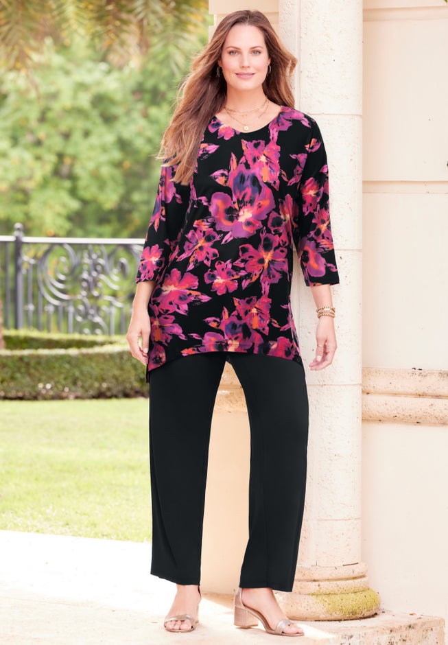 Add a little wow to your AnyWear wardrobe with this fluid V-neck tunic with flattering two-point hem and dramatic side slits.