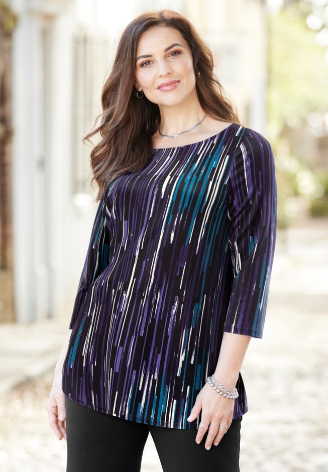 FIT: Relaxed and feminine with scoop neckline, tunic length, 3/4 sleeves and side slits for easy movement.