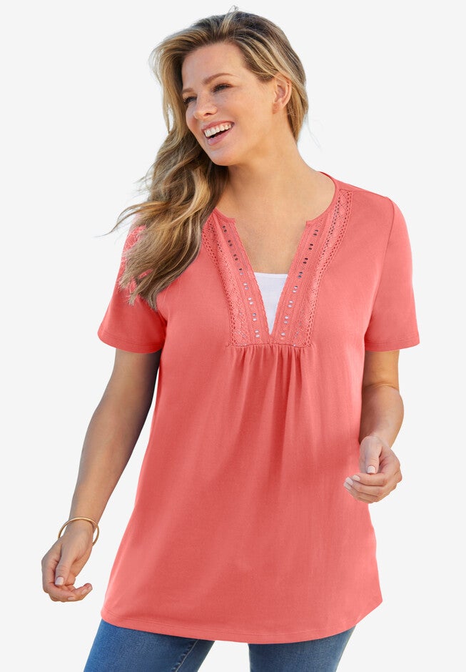 Get the layered look with none of the bulk. Details like crochet and lace trim and a split neckline make it look dressier than a tee but with all of the comfort.