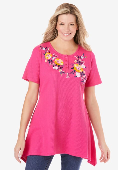 This relaxed, breezy tunic is sure to be a new staple! It has a flattering scoop neckline, beautiful floral embroidery and a soft allover waffle knit thermal texture. A sharkbite hem adds swing and shape, perfect over any of our bottoms.
