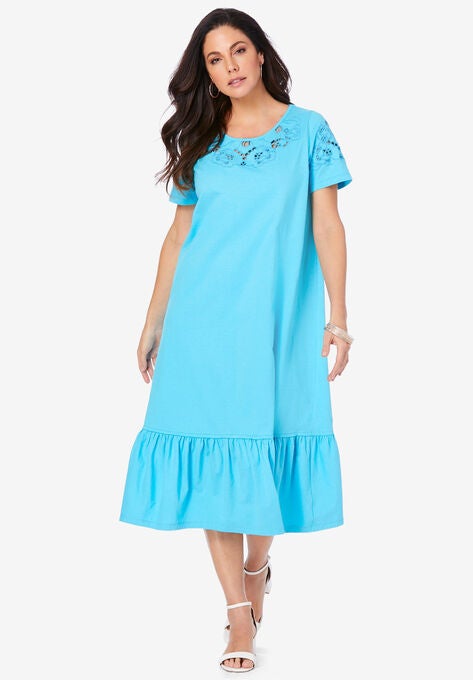 Feel so feminine in this romantic dress with floral eyelet cutouts at the scoop neckline and sleeves. The A-line silhouette flatters your figure while a ruffle at the hem offers a fun, flirty feel. Front pockets. Top it off with a cute denim jacket or accessorize with statement jewelry. Short sleeves.
