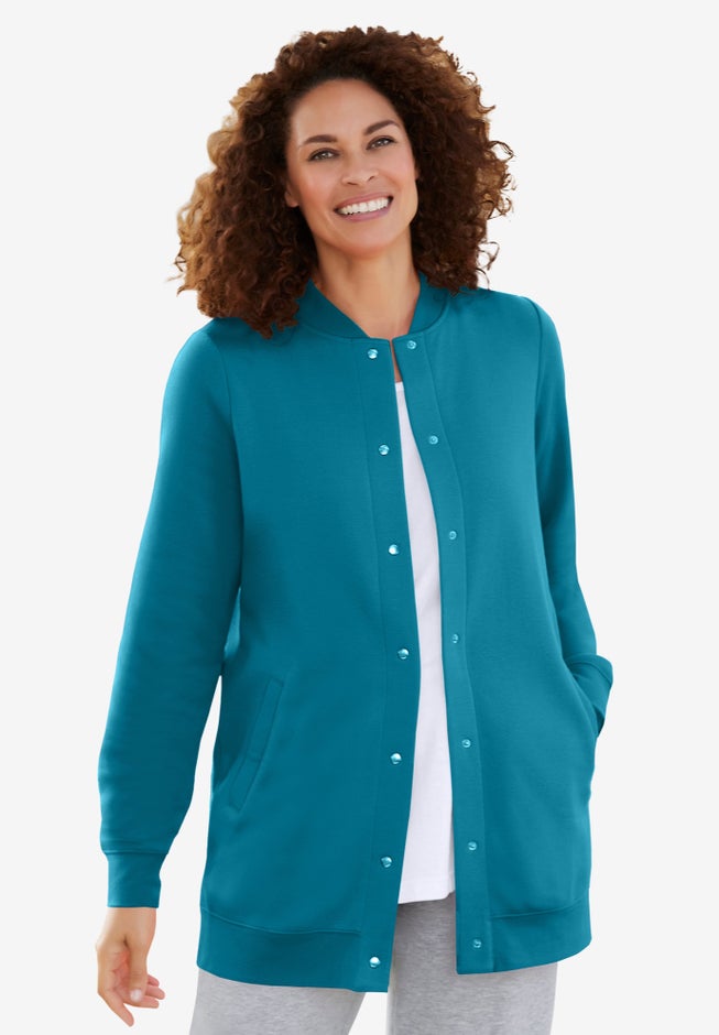 This casual baseball jacket is so relaxed and so comfy. A fleece knit is incredibly soft, and the medium-weight fabric and longer length make it great for layering. You’ll love the snap front that’s so easy to take on and off. A sporty style that goes with just about anything.