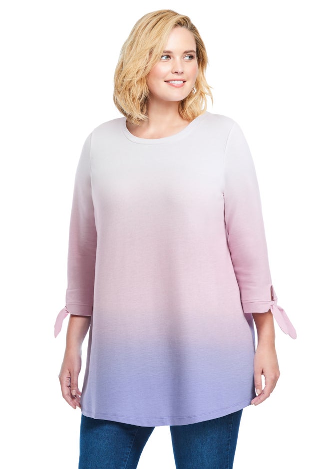 This pullover sweatshirt with a comfortable scoop neck is accented with self ties on the three-quarter sleeves. Made in a longer tunic length with a curved hem that falls over the hips, you'll love how cozy this easy French terry style is.