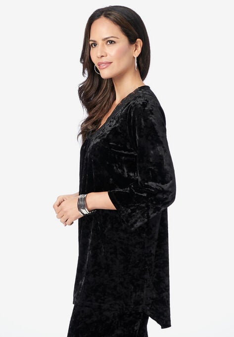 This top combines two of our favorite things: luxe velour and feminine lace. Cut for a swingy silhouette, it features a lace-trimmed V-neckline, front pleating and three-quarter sleeves with a fanciful high-low hem.