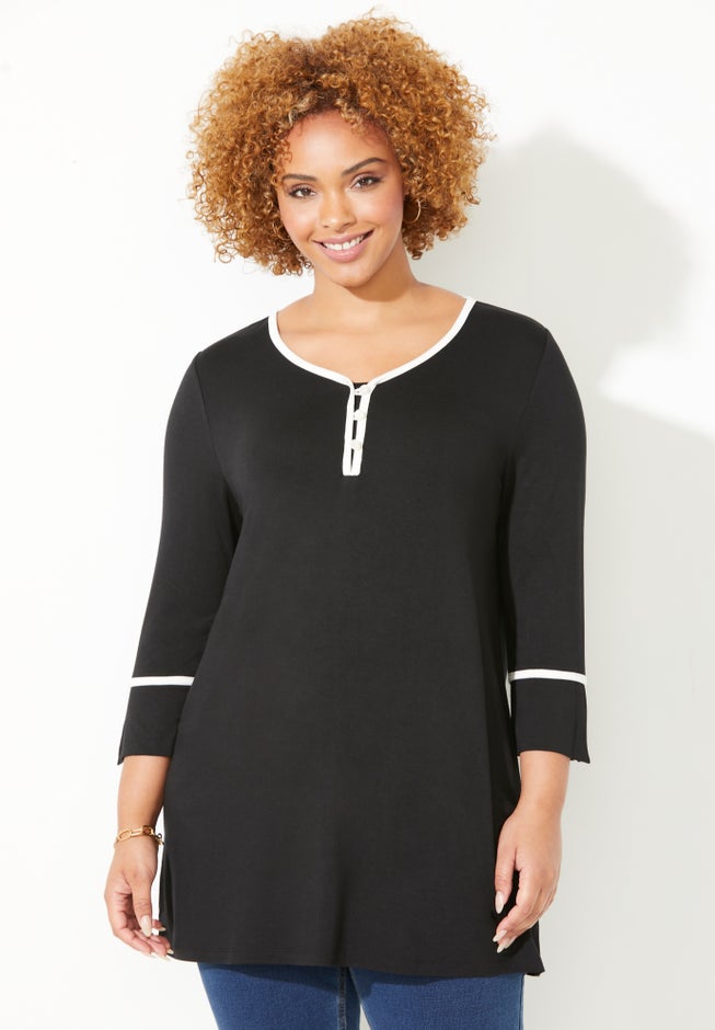Our Liz&Me™ Henley Top is relaxed and stretchy with elevated details like dome shank buttons and contrast chiffon trim so you look perfectly put-together with one easy piece. Wear with Liz&Me® chinos or trousers for an effortlessly timeless look.
