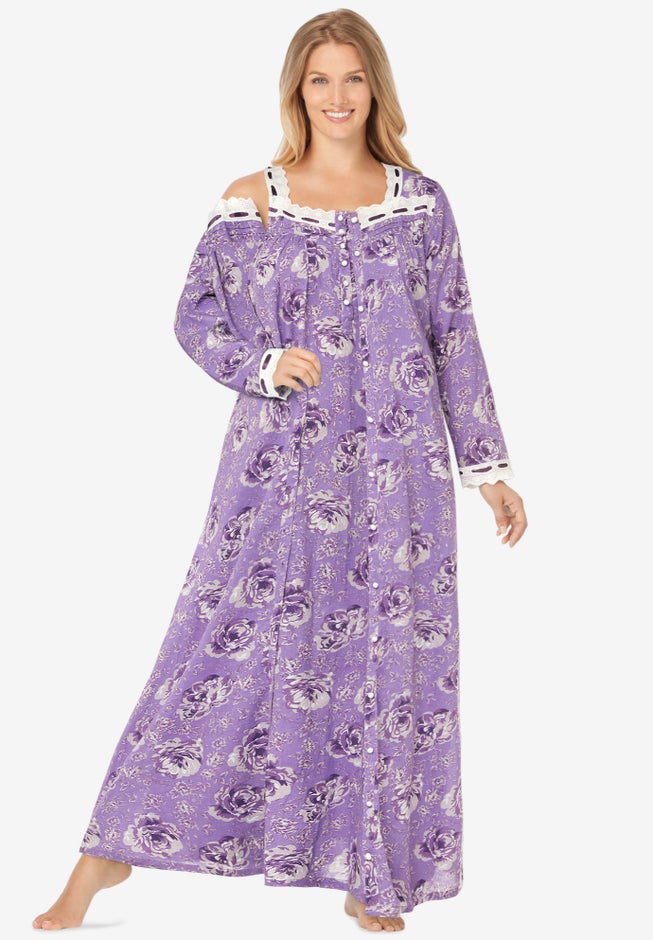 • Robe has laced eyelet trim, a sweetheart neck, and pearl button placket for a delicate touch.