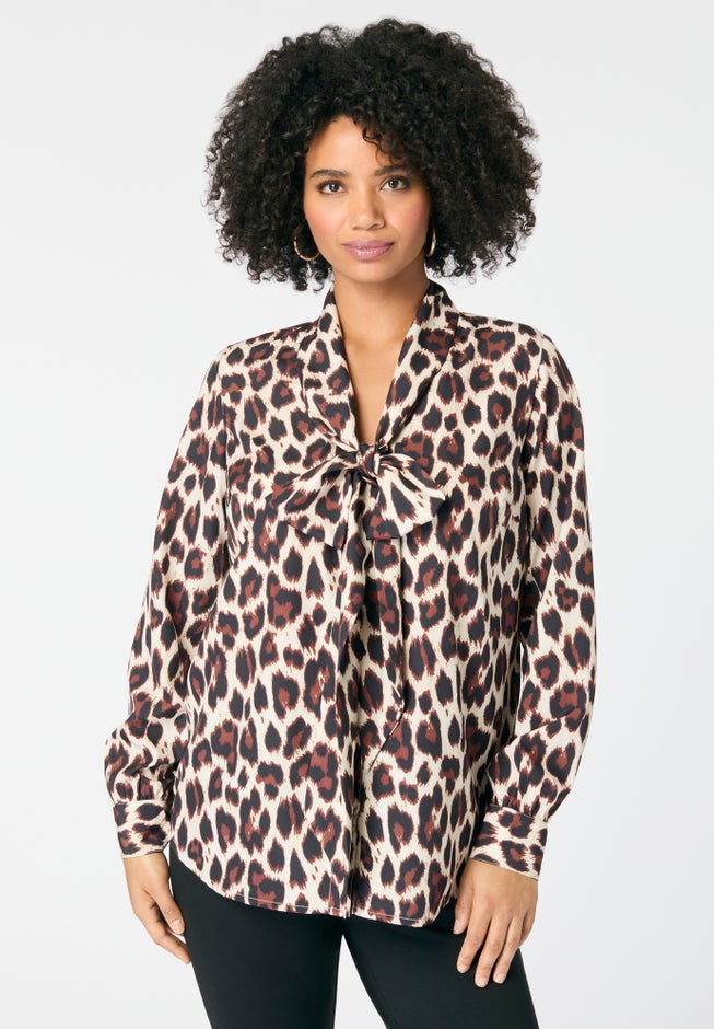 A comfortable, modest fit from desk to dinner, this top is a gorgeous style that's ready for all occasions. It's adorned with an elegant bow in front of the deep V-neckline. Long sleeves with double button cuffs. Center back shirring. Shirttail hem.