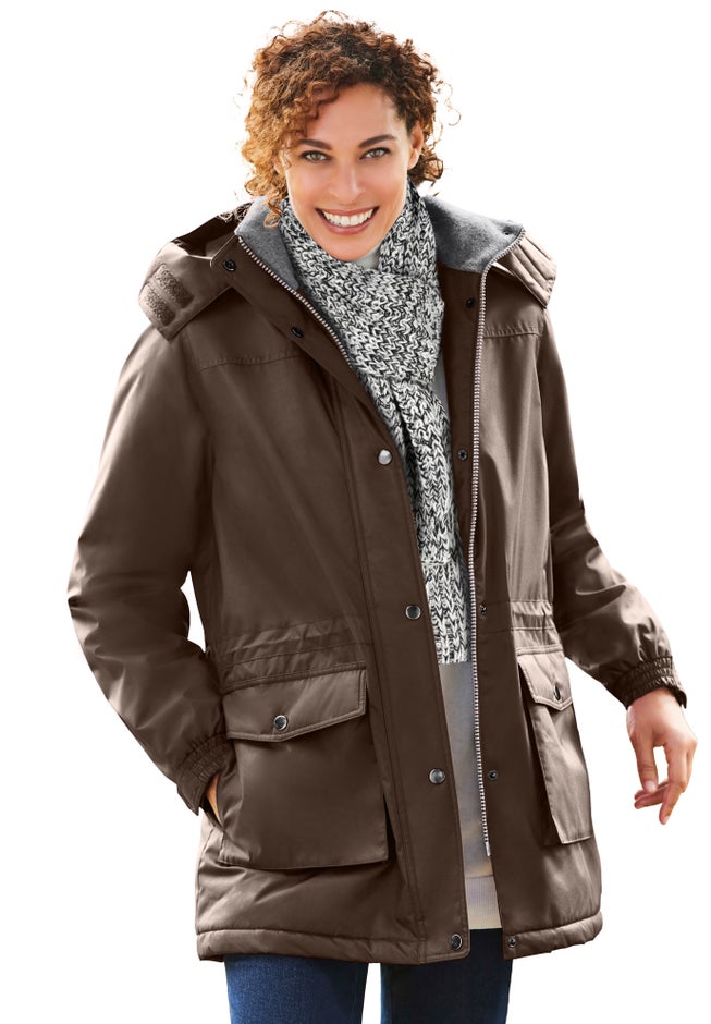 Ready for whatever winter brings. Zip-front closure with snap storm flap. Plush fleece lining. Quilted polyfill in sleeves. Detachable hood. 6 roomy pockets; interior pocket. Adjustable inside drawstring waist.