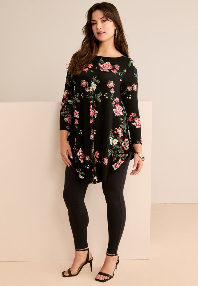 A flowy and feminine tunic crafted in extra-drapey, soft stretch fabric. The swing silhouette offers easy elegance, flowing just the way you love over your curves and wears so well with any of your favorite bottoms. It dresses up or down easily. With bracelet-length sleeves and a shaped hem.
