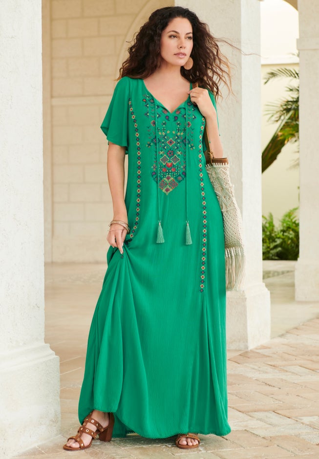 This lightweight maxi effortlessly flows over curves with an oversized A-line silhouette and features an embroidered scoop neckline with tassels and scallop trim at the hem.