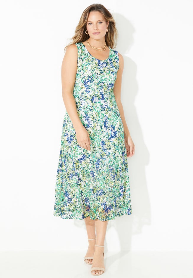 Talk about effortless style! Our sleeveless A-line dress is exquisitely crafted with allover stretch lace making it a show-stopping style for any dressy occasion. This flattering silhouette flatters every figure. Wear alone with strappy sandals or top it off with one of our breezy cardigans to complete your look.