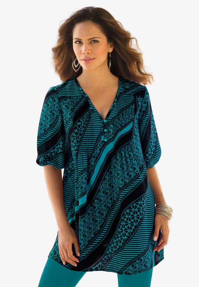 Add a little extra polish into your tops collection with this printed style. Made from lightweight georgette, it's perfect for year-round wear. Button-front design with pleated front-and back yokes. Elbow-length blouson sleeves, swing silhouette.