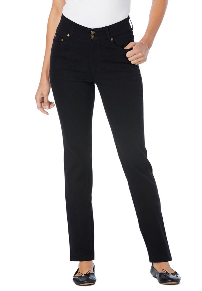 The perfect stretch fit jeans, with secret shaping panels that slim your tummy. These classic five-pocket straight-leg jeans also have a slimming inner elastic waistband for all-around comfort. Made with a sleek fit and feel, they look great and feel even better with the power of stretch. Easy on/off zip fly with jean tack button closure.