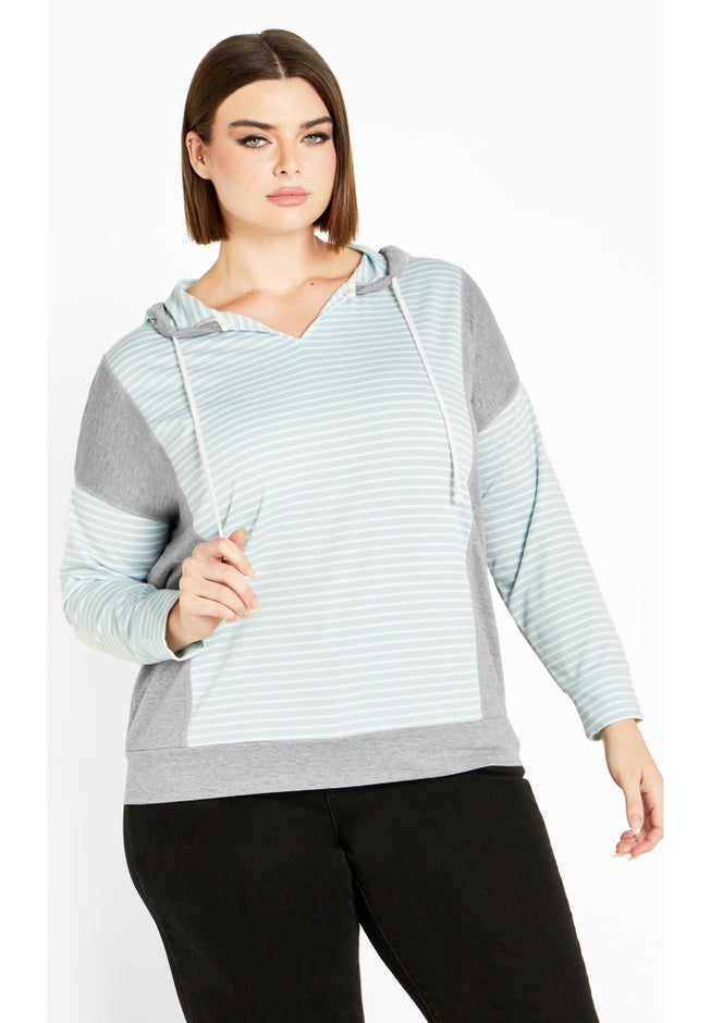 Stay on-trend with the Seeing Stripes Sweater, featuring a fashionable V-neckline, a cozy hoodie adorned with drawstrings, and full-length sleeves for a laid-back elegance.