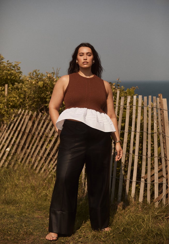 Step into effortless elegance with this fitted sweater featuring a flattering woven peplum hem. The sleeveless silhouette and classic crew neck make it a chic, versatile piece, while the soft knit ensures all-day comfort.