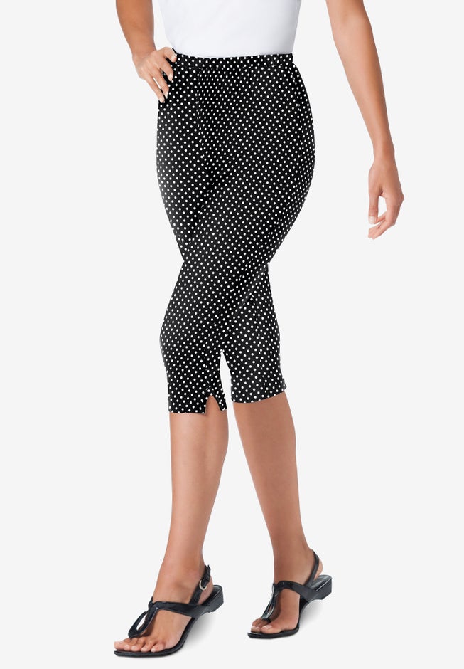 Start a great athleisure outfit with these stretch cotton knit pull-on printed capri leggings! Ideal for everything from lounging to running errands, they offer a comfy, flexible fit that moves with you. The fully covered elastic waistband ensures all-day ease. Their sleek, body-hugging silhouette creates a look that beautifully contrasts with relaxed-fit tops or oversized sweaters. This combo balances comfort and style effortlessly. Plus, the breathable stretch-cotton blend keeps you comfortable all day long!