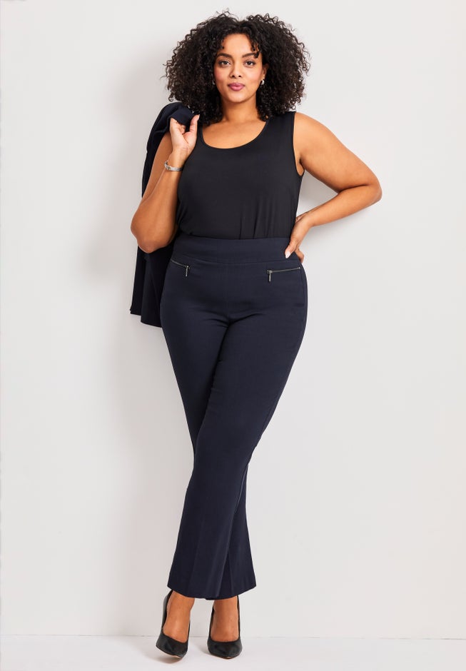 An effortless go-to style and absolutely flattering for your curves, the Super Stretch Zip Pant is a must-have addition to your wardrobe! Flaunting supportive mesh Tummy Control insert, functional zip front pockets and made with super stretch finish fabrication, you'll fall in love with the way these pants fit your silhouette! Think of your work wardrobe as your daily power suit—only cooler, comfier, and way more you.