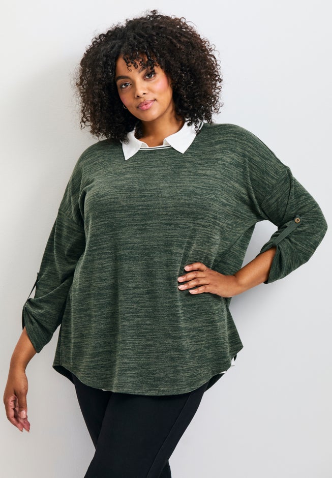 Discover the ultimate style hack with the Tara 2Fer top – a chic fusion of elegance and versatility! Effortlessly switch up your look with two garments in one; a breezy cotton voile underlayer shirt paired with a trendy Hacci 3/4 sleeve overlay. Featuring button tab sleeves and a contrast neck band, this top is your new go-to for effortless sophistication!