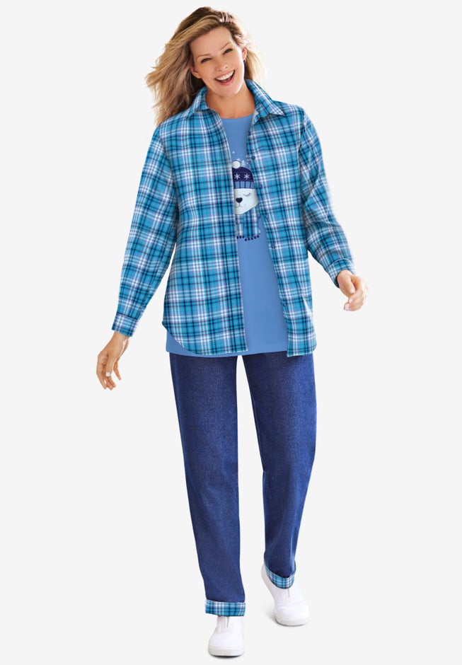 A classic combo all in one. Flannel shirt has shirt collar, full button front, back yoke, button cuffs, and straight hem. 30" tunic length. Tee has crewneck and short sleeves with 28" length.