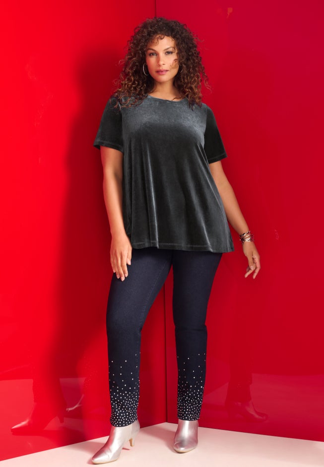 Spoil yourself a bit with the rich color and luxe comfort with our Velour Swing Tee. Its plush, soft fabric keeps it comfortable to wear no matter the occasion. Pair it with leggings for a casual day out or with trousers for a more polished look.