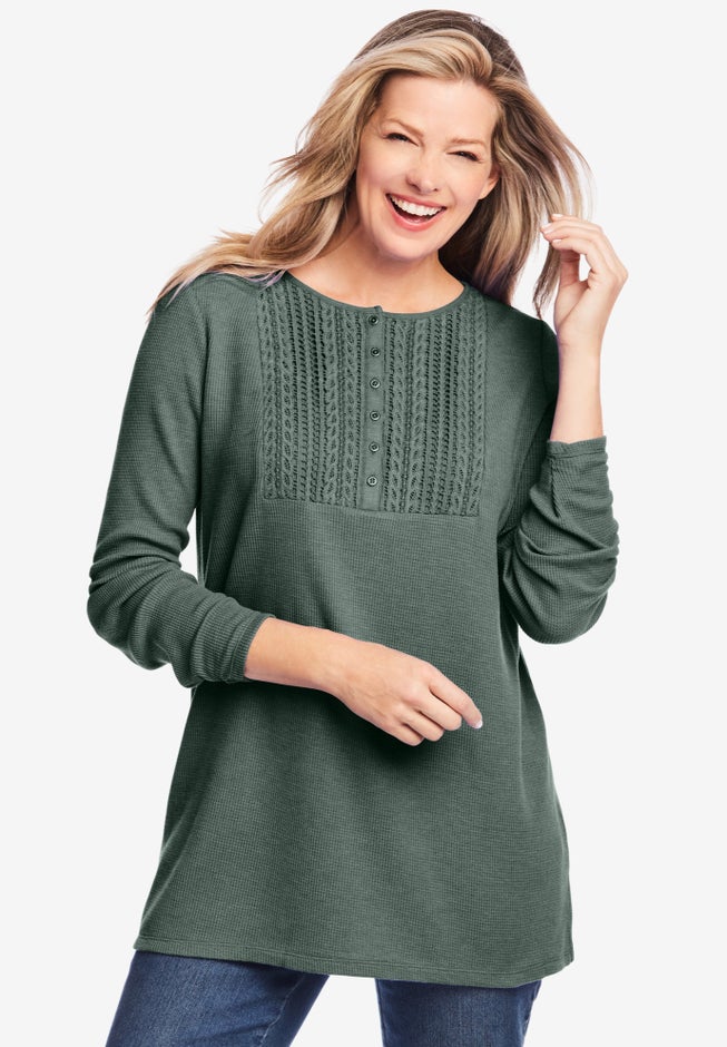 A pretty lace bib makes this Henley tee cute and comfy. This softy textured waffle knit fabric is perfect for all year around.